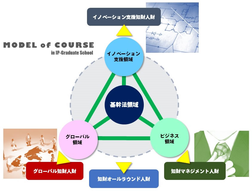 - そのため、知的財産に関わる人材といっても、いろんなバリエーションがあります。 そこで私どもでは産業界のニーズに応え、知的財産法を中心とした法律的素養を身につける「基幹法領域」、 イノベーションを支援するための実践的な知的財産のスキルを習得する「イノベーション支援領域」、 知的財産に基づく国際的な視野を養う「グローバル領域」、 知的財産をビジネスに活用するセンスを培う「ビジネス領域」の4領域を中心にカリキュラムを構成しています。 授業科目数はおよそ60科目にも及びます。