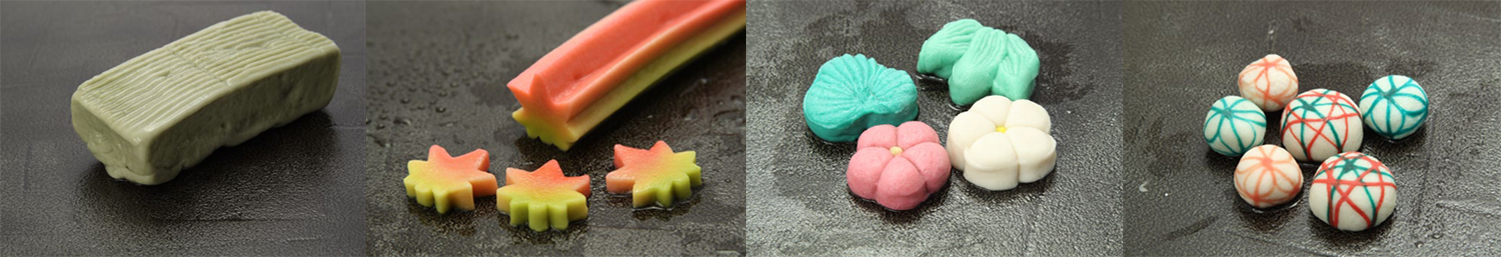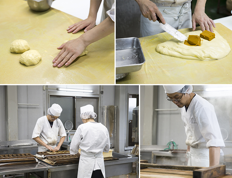 - 生麩の生地です。麩は大きく生麩と焼麩とに分かれますが、原料はどちらも小麦たんぱく、いわゆるグルテンです。生麩の場合は小麦粉から取り出したグルテンにつなぎとして餅粉を練りこみます。これが生麩の土台となります。今日はそこにかぼちゃを練りこんだ商品を作っております。適切な大きさに切り分け、木型にはめ、蒸し器で蒸した後、冷やします。