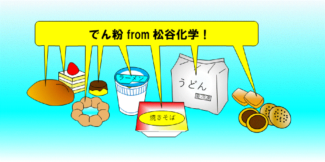- 代表的な用途は食品です。でん粉はトウモロコシや馬鈴薯、小麦などから作られますが、原料ごとに特性があり、加工することでさらに様々な機能を付加することができます。最近、おもちのような弾力をもったパンを食べたことはありませんか。あの食感は、加工したでん粉を加えることで生まれるのです。