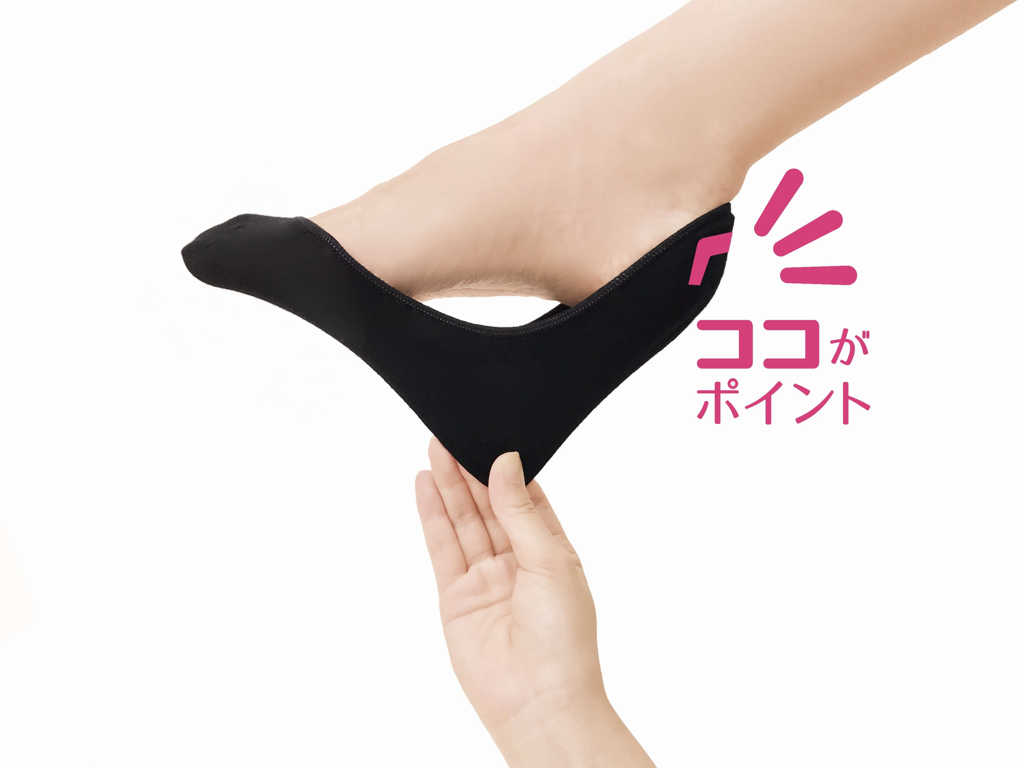 - 1本線や波線などいろいろな形状のストッパーを備えたフットカバーがありました。でも靴との摩擦で履いているうちに、どうしても脱げてしまっていたのです。どうすれば靴下を足にピタッとフィットさせ、”脱げない”状態を実現することができるかと試行錯誤した結果、縦と横、どちらの方向もズレを防止する必要があることが分かり、「コの字型」に辿り着きました。