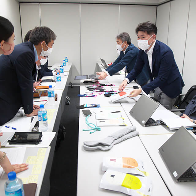 - 当社の『SUPER SOX』というムレや臭いを対策した靴下は、開発当初、世の中にある素材では私たちが創ろうとしている機能と品質を両立したお悩み解決の靴下が創れないということで、糸から開発しました。糸のメーカーさんにもご協力をいただきながら細かい調整を重ね試行錯誤しました。