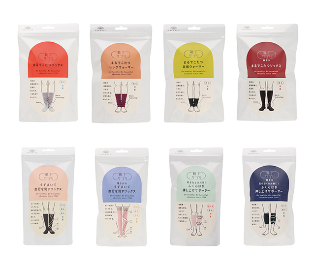 - 靴下は、一般的には商品そのものが外に出ているような包装が多いのですが、「靴下サプリ」シリーズはサプリメントをイメージした袋入りを採用しました。靴下が完全にパッケージの中に隠れているので、新鮮さがあってお客様にも喜んでいただけているようです。店頭では普通のサプリメントのようにシリーズでパッケージを並べて靴下の“サプリ感”を出していただいています。