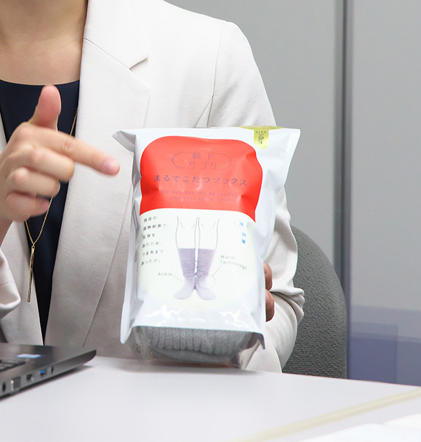 - 「まるでこたつソックス」は、会社にとって大切なブランドの一つです。それが流行ってくると、真似するところが出てきます。その類似品を勘違いして買われてしまうお客様もいらっしゃって…。効果を期待されているお客様が類似品を買ってがっかりされることは、私たちの想いとも異なりますので、知財で守らないといけないと考えています。