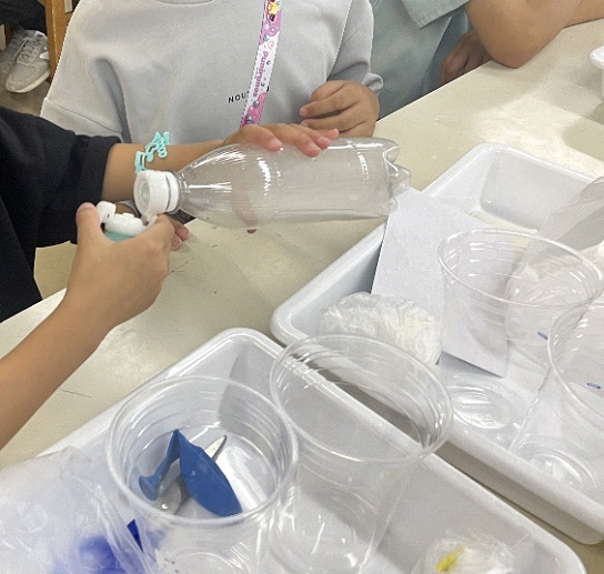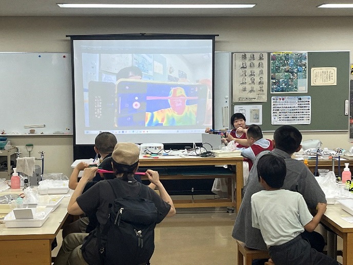 (1)うちわでひんやり 左手を水で濡らし、右手はそのままで、お向かいの人にあおいでもらう実験を行った。濡らした手の方が涼しいことを参加者は実感していた。これは水が気化することで手の熱を奪うことを講師が説明した。参加者に30cc内の水分子の数を想像して頂いてその数を発表してもらった。そして、その数を回答したところ、その数の多さに参加者は驚いていた。 (2)空気でひんやり エタノールを少量入れた炭酸水用ペットボトルに空気ポンプで空気を入れ、その後、ポンプを抜いて一気に空気を逃がす実験を行った。一気に空気を逃がすことで水蒸気が冷えて雲が発生し、参加者はそれを楽しんでいた。 (3)化学反応でひんやり(重曹とクエン酸) ポリ袋に重曹とクエン酸を入れる実験を行った。この段階ではひんやりしない。さらに水を入れる実験を行った。一気に反応して、参加者はひんやりを実感していた。 (4)ゴム風船でひんやり ゴム風船を伸ばしてすぐに鼻に当てる実験を行った。参加者は温かくなっているのを鼻で感じて驚いていた。反対にゴムを伸ばした状態から縮めてすぐに鼻に当てる実験を行った。参加者は冷たくなっているのを鼻で感じてまた驚いていた。講師がサーモグラフィーを用いてこの現象を視覚的に示したところ、参加者はまた驚いていた。 (5)溶けるだけでひんやり(尿素) まず、講師が尿素を水に入れて温度を温度計で測って見せた。すぐに温度が下がっていたことに参加者は驚いていた。次に、参加者は以下の実験を行った。まず、尿素をチャック袋の外からさわってみた。この段階ではひんやりしない。薄いポリ袋に水を入れて、なるべく空気を抜いて、口を縛り、余ったところを切り落とした。尿素が入ったチャック袋に水入りポリ袋も入れて、なるべく空気を抜いて、チャックを閉めた。チャック袋を外から押すと中のポリ袋がやぶれ水が出て、尿素が水に溶け、参加者はひんやりを実感していた。この尿素実験セットのもう一組は参加者のお土産とした。 以上の実験の最中、兵庫地区会運営委員(楠屋地区会長、東副地区会長、岩元副地区会長、三条委員の計4名)は参加者を適宜サポートした。