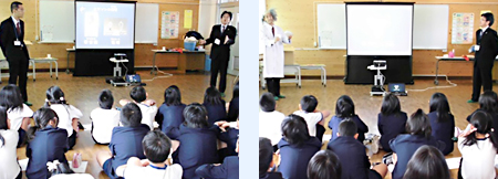 担当部署 | 日本弁理士会近畿支部 知財制度普及委員会 | コメント | 南海堺東駅から徒歩10分ほど、堺市の中心部の熊野(“ゆや”と読みます)におじゃましました。 ここの児童たちは特に積極的で元気。質問したら多くの手が挙がり、前に出て発明品の検討をしてもらうときにも、多くの児童たちが名乗り出てくれて、こちらとしてはうれしい限り。 寸劇では、怪人Xを先生に演じてもらいましたが、軽いノリで模倣品を販売する怪人Xには共感できなかったのか、裁判で負けた後に怪人Xがかわいそうと思う生徒はほとんどいませんでした。発明者を守ること、弁理士の仕事が理解してもらえたかな、と思います。 知財授業のレポートを提出しなくてはいけないのか、皆、提出用の紙を持参し、そこにメモを取りながら参加していました。最後に先生が「今日の帰りまでに提出!」と言ってましたので、終わってから内容をまとめているのでしょうか。 授業後には、プニョプニョピンやサラカップルなどの発明品を手に取って試している児童が多くおり、興味は尽きない様子でした。 |