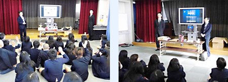 ![]() 興味津々の児童達に講義を行う講師陣 (左写真左から 三宅 康雅、吉永 元貴 各弁理士) |