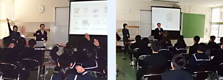 ![]() 興味津々の生徒達に講義を行う講師陣 (左写真左から 立川 伸子、水田 慎一 各弁理士) |