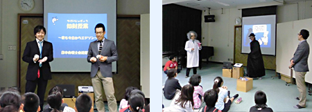 担当部署 | 日本弁理士会近畿支部 知財制度普及委員会 | コメント | 阪急逆瀬川駅で落ち合った我々講師2名は、折りしもの秋雨で増水した逆瀬川を横目に眺めつつ、高台のてっぺんに位置する「宝塚市立逆瀬台小学校」へと向かいました。宝塚市内の小学校としては初めての知財授業ということで、今日はどんな児童達と会えるかな、いい授業にしたいよね、などと抱負を語り合っているうちに、同校へと到着しました。 教頭先生に挨拶を済ませ、担当の先生と共に廊下を歩いていると、廊下の先方に整列している児童達の姿が見えてきました。「ここからは児童達が案内致します」と担当の先生がバトンタッチすると、「こんにちは!ようこそお越し下さいました。こちらへどうぞ。案内致します!」と、大の大人でもかくや、と思えるほどの礼儀正しさで、児童達が我々をエスコートしてくれました。会場に着いた後も、「テーブルはいりませんか?」「椅子を運びましょうか?」「他にお手伝いできることはありませんか?」と常に我々を気遣ってくれ、そのホスピタリティー溢れる対応に、大いに感動しました。 今回の知財授業は、同じクラスの児童に対して2コマの授業ということもあり、1コマ目で通常通りの知財授業を、2コマ目で知財(特許・商標)の基礎的な話を行いました。終始反応の良い児童達でしたが、特に、担任の先生がノリノリで怪人Xを演じたところや、千原弁理士が自転車の「チリンチリン」を例に特許を説明したところ、齊藤が「面白い恋人」を例に商標の説明をしたところなどは、大いに盛り上がりました。また、2コマ目の残り時間で、我々講師2名がどういう学生時代を過ごし、なぜ弁理士になりたいと思ったかについて話をすると、児童達も目を輝かせ、「僕も弁理士になりたいです!」「商標って面白いと思いました!」などと嬉しい感想を聞かせてくれました。 私が初めて知財授業を受け持ったのは2006年の秋、某小学校の元気な5年生達でした。それから早6年が経ち、当時小さかった児童達も来春には大学生になります。私たちの授業を受けた児童達が、「先生の授業を見て弁理士になったんです!」と話しかけてくれる日が来るのだろうか、そんなこと言われたら嬉しすぎるよね、と2人で他愛もない話をしながら、宝塚市立逆瀬台小学校を後にしました。 |