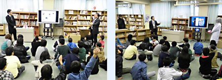 ![]() 興味津々の児童達に講義を行う講師陣 (左写真左から 山田 淳一、中塚 雅也 各弁理士) |