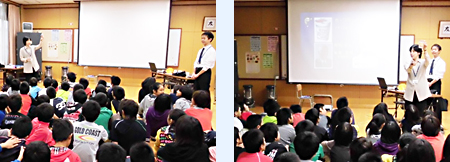 担当部署 | 日本弁理士会近畿支部 知財制度普及委員会 | コメント | 今回の知財特別授業は、京都と大阪の境近くに位置する「明親小学校」で行われました。私の通っていた小学校は、明親小学校よりもう少し北にあるのですが、同じ京都市内の小学校という事情もあり、明親小学校と私の母校の校舎の外観がよく似ていました。そのためか、30年前(!)の記憶をつい思い出してしまいました。 今回、立川弁理士と二人で、「君も今日からエジソン」を題材とした知財授業を担当しました。およそ80名の子ども達が、普通の教室より少し広い部屋でちょっと窮屈にしながらも、立川弁理士の「手際良く流れていく授業」を熱心に受けていました。今回の知財授業において、「肩ブレラの問題で、子どもが“紐を括り付けた荷物を首からぶら下げて傘を持つ”という斬新なアイデアを披露した」「小学校の先生扮する怪人Ⅹが、生徒を巻き込んだアドリブを入れ、授業を盛り上げた」「授業の終了後、多くの子ども達が道具(特に手品用ぬいぐるみ)を興味深げに触っていた」点が、特に印象的でした。明親小学校の子ども達に対して、「とても素直で好奇心旺盛だな」と感じました。 明親小学校は、江戸時代の万延元年に設立された、とても永い歴史を持つ小学校です。知財授業を行った部屋に展示されていた「大正時代のモノクロ写真」等から、その永い歴史を感じ取ることができました。知財授業を受けた子ども達の誰かが弁理士となって、この小学校の歴史に名を遺してくれることを願います。 |