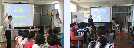 担当部署 | 日本弁理士会近畿支部 知財制度普及委員会 | コメント | 今回の知財特別授業の教室となった「玉緒小学校」は、滋賀県と三重県の境に近い場所に位置し、山や田畑といった緑に囲まれています。当日の天候は雨でしたが、雨に濡れた緑がとても綺麗で印象的でした。 今回、大西弁理士と二人で、「君も今日からエジソン」を題材とした知財授業を担当しました。授業が始まってしばらくの間、子どもたちは、前に出てくるのをためらったり、なかなか質問に答えなかったりして、授業に対して遠慮気味でした。しかし、大西弁理士の「聞く人を惹きつける、明朗快活な授業スタイル」によって、更には小学校の先生による怪人Ⅹの名演技(私よりもずっとお上手でした!)もあって、徐々に授業に熱中しました。「肩ブレラ」のテーマでは、前に出ていた子どもが、座っていた自分の友達を次々巻き込んだ上、授業そっちのけで自分たちだけでアイデア出しをしていました。また、授業の合間の休み時間や授業の終了後は、冗談交じりに大西弁理士や私に話しかけたり、特許権に関する鋭い質問をしたりする子どももいました。「少し恥ずかしがり屋さんだけど、人懐っこくて元気が良い子どもたちだな」と、個人的に思いました。 玉緒小学校では、六年生に対して「職業について考えさせる授業」を行っています。そこで大西弁理士が、「13歳のハローワーク」を引用して、弁理士の仕事を丁寧にお話されました。今回の知財授業によって、子どもたちが弁理士という職業に興味を持ち、志してくれることを願います。 |