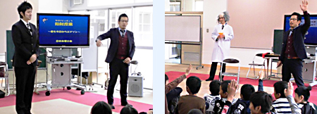 ![]() 興味津々の児童達に講義を行う講師陣 (左写真左から 大代 和昭、千原 清誠 各弁理士) |