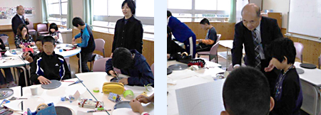 担当部署 | 日本弁理士会近畿支部 知財制度普及委員会 | コメント | 今回の小学校は泉北ニュータウンにあります。泉北高速鉄道の駅からちょうど紅葉の美しい遊歩道を歩くこと5分程度で閑静な住宅地域にある小学校につきました。授業開始前に校長先生とのお話しのなかで、最盛期には1,500名を超えた在校生数も今では200名余りとなった事実を聞かされ、大阪を代表する泉北ニュータウンにおいても少子高齢化が急速に進んでいる現状を目の当たりにしました。 今回の発明工作授業は6年生が対象ですが、1クラスの人数が20名という小規模なので、2クラス41名を対象としてランチルームという広いスペースで始まりました。地元ご出身という立川弁理士の熱のこもった司会で快調に授業は進行していきました。子どもたちはビー玉が好き。徐々にテープで張り付けたり、紙で囲いを作ったり、回転台のフタの安定性を工夫するアイデアが出始めました。すかさず、立川弁理士が新しいアイデアをみんなに披露して、アイデアの進化を促していきました。ちょうど、盛りあがったところで、タイムアップ。様々な参考事例を紹介して授業は終了しました。授業中は若い男の担任の先生が2人参加され、子どもたちの私語が増えた際には、大きなよく通る声で注意してくださり、スムースな進行に協力してくださいました。最後は切り残しの紙やゴミをみんなで清掃して、ご挨拶をして授業は終了しました。 |