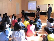 ![]() ![]() 興味津々の児童達に講義を行う講師陣 (左写真左から、伊原 節子、吉本 力 各弁理士) |