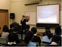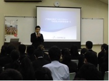 ![]() ![]() 興味津々の生徒達に講義を行う講師 (千原 清誠 弁理士) |