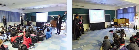担当部署 | 日本弁理士会近畿支部 知財制度普及委員会 | コメント | 神戸市立板宿小学校は、山陽・地下鉄板宿駅から徒歩5分という便利な場所にあり、阪神大震災の復興シンボルとして設置された「鉄人28号」像には歩いて行くことができます。 当日は寒波で気温がかなり低下しましたが、運動場では児童(おそらく低学年)が半パン姿で元気に体育の授業(サッカー)を受けていて、知財授業でも元気に発言してくれる児童を期待しながら校舎に入りました。 今回の配役ですが、司会は須藤弁理士、博士は大西弁理士、怪人Xは宮村が担当しました。授業の最初は少し戸惑い気味だった児童たちも、須藤弁理士の分かりやすい進行が功を奏し、すぐに積極的に発言してくれるようになりました。「発明で思い浮かぶ人物は誰ですか」という問い掛けでは、お約束のエジソンに加え、最新の話題を反映した人名であるスティーブ・ジョブズを複数の児童が大きな声で答えてくれたのには少し驚かされました。また、肩ブレラのくだりでは、日常の不便なことを発明品で解決できることを実感してもらえたようで、「すごく便利そう」「それ欲しい」という声があちこちから聞こえました。 知財授業の最後では、児童2名(男子1名、女子1名)が感想を述べてくれたのですが、どちらの児童も、「発明はもっとすごいものだと思っていたけど、今日の説明で、身近なものだということが分かりました」という主旨のことを発言してくれました。また、「将来は発明をしたい」と発言をした児童もいたそうです。 今回の知財授業は4時限目でしたので給食がすぐに始まるにも関わらず、授業後は多くの児童が発明品に集まり、先生に促されるまで教室に戻らないほどの興味を示してくれました。また、校長先生から「難しそうな話題をかみ砕いて説明していて、とても分かりやすかったです」というお言葉をいただきました。今回の知財授業をきっかけにして、発明の意義および弁理士という職業に対する理解を、児童および先生方が少しでも深めていただけたなら幸いです。 |