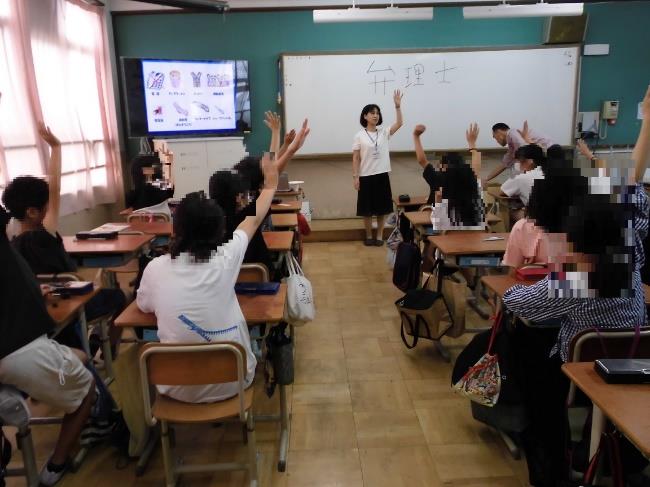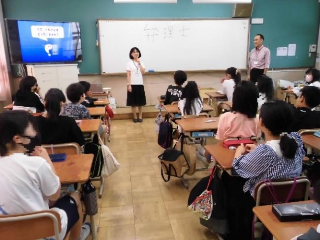 京都市立北醍醐小学校の6年生28名を対象に知財授業「君も今日からエジソン」を行いました。同校は山科にあり、平安時代の歌人小野小町が晩年を過ごした随心院の東に広がる住宅地にある小学校です。 今回は、知財授業用に会場を用意してもらうことはせずに、6年生がいつも授業を受けている教室を会場にし、教室に備え付けられた大型ディスプレイにパソコンの画面を出力しました。慣れた教室であったことや、大型ディスプレイが見やすかったことで生徒には良い環境で知財授業を行うことができたと思います。 導入部分で、進行役の三方弁理士が、弁理士の登場するテレビドラマについて話をすると、見たことがあるという声もあがり、知的財産や弁理士について興味を持った状態で本題の知財授業に入ることができたと感じました。 サラカップルやシャンプーを題材にし、不便をどうしたら解決できるかを考えてもらう場面や寸劇後のクイズでは多くの生徒から手が上がり、スムーズに授業を進めることができました。また、代表の生徒2名に前に出てもらい、「肩ブレラ」の発明について考えてもらう場面では、着席した生徒からもアイディアが出るなど非常に盛り上がった授業となりました。寸劇では、博士役を大濱弁理士が担当し、発明品を模倣する怪人X役を同校の先生に演じていただきました。怪人X役の先生には面白おかしいゼスチャーも交えて熱演していただき、生徒は非常に楽しんで寸劇を見ることが出来たと思います。 クイズが終了した後には、大阪・関西万博のこと、7月の弁理士の日のイベントのことについて紹介を行い、知財授業を終えました。 終了直前に質問の機会を設けたところ、児童から、どうすれば特許をとれるのか、などの質問があり、特許について興味を持ってもらい、弁理士の仕事も知ってもらうという目的に対して良い授業を行うことができたのではないかと思います。 |
