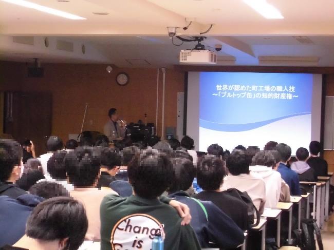 今回は、舞鶴港近くの京都府舞鶴市にある自然豊かな舞鶴工業高等専門学校にて、3年生4クラス(機械、電気情報、電子制御、建築システム)に所属する学生の皆さんを対象に、知的財産特別授業を行いました。知的財産権について全般的な説明を行った後、コインロッカーとプルトップ缶の知的財産権についてクイズを交えて説明しました。学生の皆さんは、それぞれ専門性のある工業学科を選択しており、知的財産権と非常に親和性が高く、特許や意匠に関する事例に興味を持って聞いてくれました。 担当教諭からは、将来の就職活動や就職した後に知的財産権に触れる機会が多いことから、学生の時から知的財産権に興味を持ってもらいたいという意向でしたので、知的財産権全般の説明をした後に具体的な事例を交えた話をする講義形式を採用しました。最後に、大阪・関西万博についても説明したところ、万博会場となる夢洲を知っている学生も複数人いたので、将来、日本の産業を担う学生達に是非万博を経験して欲しいと痛感しました。講義終了後に質問に来てくれた学生もいて、弁理士という職業に興味を持ったとのことで大変嬉しく感じました。 |