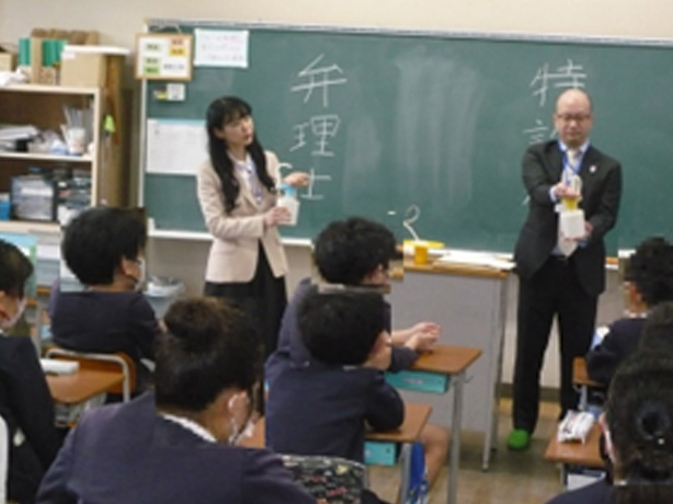 肝心の授業では、「発明」「特許権」といった耳慣れない言葉の登場にもかかわらず、私たちの説明に全員が熱心に耳を傾けてくれていました。「発明って何でしょう」といった、大人でも答えに戸惑うような質問に対しても、「新しいものを考えること」と正確な答えが直ぐに出てきて驚かされました。特許権侵害の寸劇は本日一番の盛り上がりを見せたと思います。F博士のような人がいなくなったら新しい発明が生まれなくなって世の中の進歩が止まってしまうこと、そのためには特許制度が必要であること、弁理士は発明と発明家を守る仕事をしていることを寸劇を通じて伝えられたと思います。最後のクイズタイムも好評で、多くの身近な物が日本人によって発明されたことを知って驚いている児童が多くいたのが印象的でした。