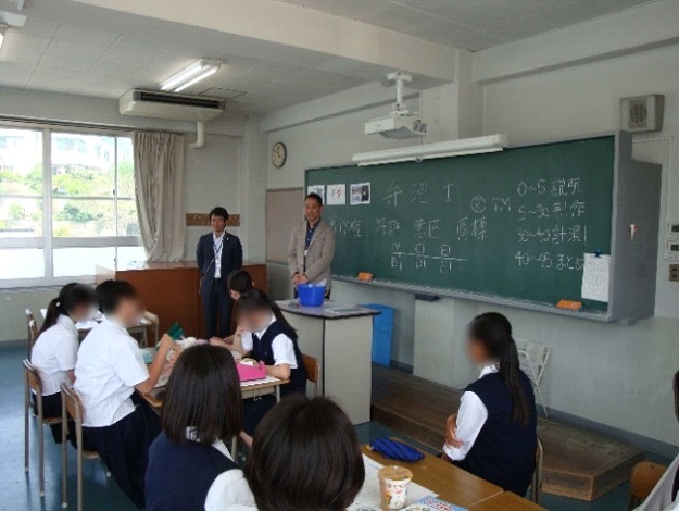授業の司会進行は中村弁理士が行い、サポート役を桝本弁理士が行いました。生徒が来る前に席の配置や配布資料の設置、弁理士の説明などの板書などの準備を行い、授業が始まったら中村弁理士による弁理士や知的財産の説明が行われました。続いて日本にある有名なタワーの構造の説明と、ペーパータワー制作のルールの説明が行われました。その後、25~30分ほどで生徒たちによるタワーの制作が行われました。