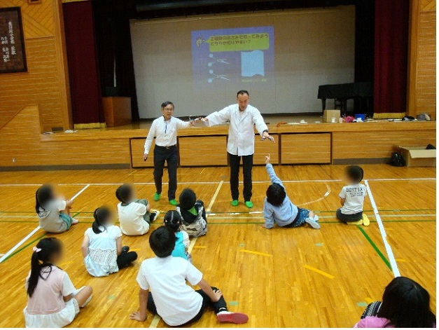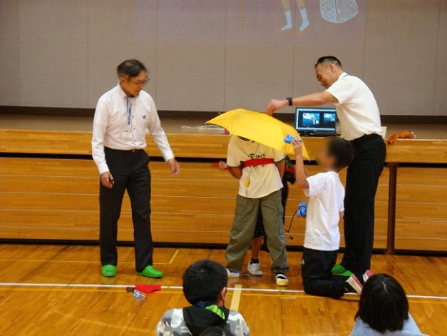 京都府亀岡市の中心部から南へ約12km離れた、大阪府の高槻市や茨木市にも近い山間部にある亀岡市立東別院小学校で知的財産特別授業として「(寸劇)君も今日からエジソン」のコンテンツを使った授業を行いました。体育館に集まった4年生から6年生までの13名の児童を対象に、進行と弁理士役を渥美弁理士が、F博士役を大濱弁理士が担当し、怪人役を教頭先生に担当していただいて授業を進めました。 渥美弁理士が自在に操る人形(チャッピー)で児童の関心を集め、最初に「発明とは何でしょうか?」という質問から授業を開始しました。授業中には、講師からの質問には多くの手が上がり、児童の代表に前に出てもらってカタシャンボトル、サラカップルや肩ブレラの発明着想を体験してもらうところでも、着席している児童からも声が上がるなど非常に盛り上がった授業となりました。また、教頭先生は自前の怪人衣装で登場するだけでなく、アドリブ満載で演じていただき、児童からも大きな歓声が上がりました。 クイズコーナーでは間違えた児童は着席するというルールで進行したところ、一人の児童が全問正解となり全員から大きな拍手が沸き起こり、非常に盛り上がった状態で知的財産特別授業を終えました。 最後に2025大阪・関西万博が新しいモノ(発明)が集まる場所であり、ぜひ体験して欲しいという案内をしました。 授業の冒頭での「弁理士を知っている人?」という質問には一つも手が挙がりませんでしたが、寸劇を通して発明を守る仕組みと弁理士の役割について勉強してもらったことで、児童の中からモノ作りや弁理士に興味をもってもらえたのではないかと思います。 |