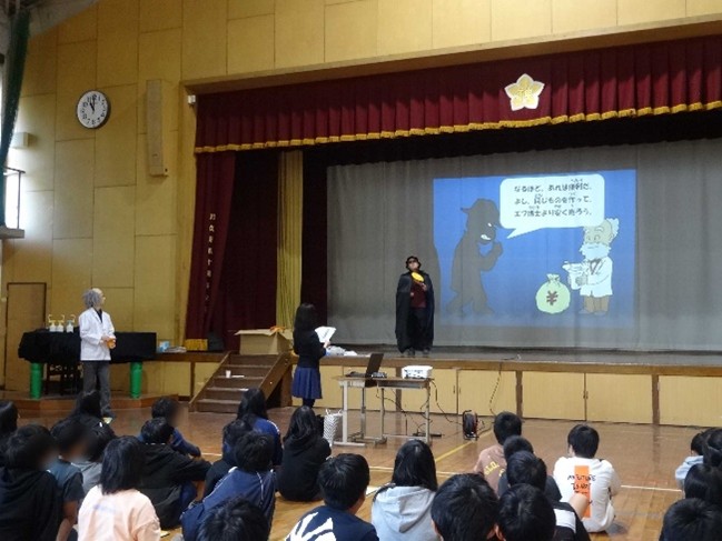 コメント | 長岡京駅からバスで約15分。京都市立神川小学校の広い体育館で劇をしました。児童の皆さんは最初は「特許って何だろう?」「弁理士?」という顔で静かに説明を聞いているだけでした。 でも、怪盗X役の先生が登場してからは盛り上がって大騒ぎでした。普段は優しい先生が悪そうなセリフを言うギャップが面白かったようです。講師たちもつい微笑んでしまうほど素晴らしい悪っぷりでした。 帰り際に児童たちに遭ったときに、吉永弁理士を見て「あ、エフ博士だ!」と気づいてあいさつをしてくれました。 怪盗X役の先生を見る度に弁理士のことも思い出してくれるかもしれないなと思いました。 |