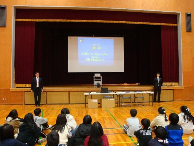 コメント | 西宮市立東山台小学校を訪問し、知的財産特別授業を行ってまいりました。東山台小学校は、西宮名塩ニュータウンの住宅地内に位置する小学校で、JR西宮名塩駅から徒歩20分ほどのところにあります。 今回は、「君も今日からエジソン」を、6年生2クラスに対して授業をさせていただきました。授業では、はじめに「発明」とはどういうものかを説明した後、生活の中の「ちょっとした不便」を解決する発明(サラカップル、カタシャンボトル、肩ブレラなど)を紹介しました。発明の紹介のところでは、児童の皆さんにも解決方法を考えてもらい発表してもらいましたが、自由な発想のアイデアが活発に出ていました。特に「プニョプニョピン」という新しい画鋲は、皆さん興味津々だったようで、実際に手に取って見てもらったところ、「すごい」と声があがっていました。 また「サラカップル」を題材とした寸劇では、司会進行役を中野弁理士が担当し、発明者のエフ博士を倉橋弁理士が担当しましたが、途中、担当の先生が(サラカップルを模倣して儲ける)怪人X役として登場したときには大盛り上がりで、楽しんで寸劇を観てくれたと感じました。さらに、クイズでは、児童の皆さんが思い思いに手を挙げてくれて、積極的に授業に参加してくれました。 今回の授業をとおして、児童の皆さんが、「生活の中の不便を解消する工夫・発明をすること」「発明を守ること」の大切さについて、興味をもってもらえたのではないかと思います。 |