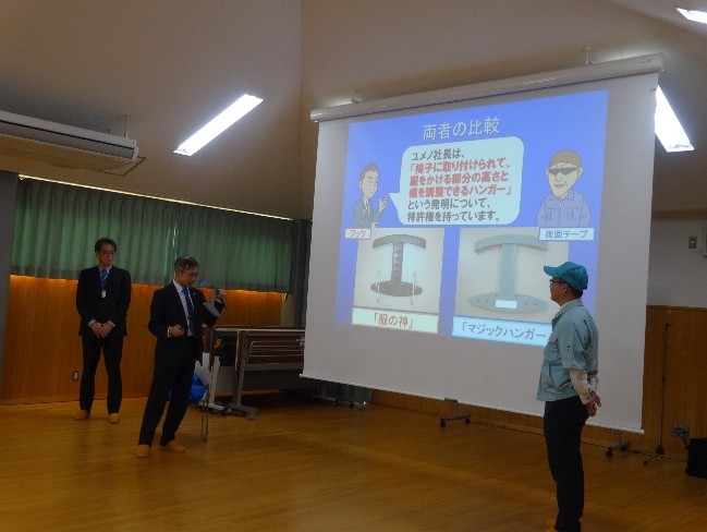 つぎに、寸劇では、「服の神(オフィス椅子の背もたれに取り付ける上着掛け用ハンガー)」について、発明者の「ユメノ社長」と模倣品の販売者「マネタ社長」のやり取りを通して、発明と発明者を守るための制度である特許制度の説明をしました。学級担任の先生1名にも百貨店のバイヤー役として登場していただいたこともあり、寸劇は大いに盛り上がり、楽しい雰囲気で授業を行うことが出来ました。特許制度があることで、発明が奨励されて、その結果便利なものがどんどん生まれ、我々の生活が豊かになることを理解してもらえたと思います。