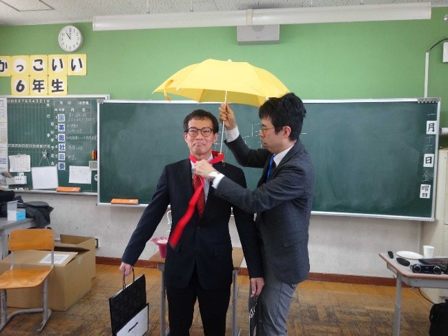 海南市立北野上小学校にて、知財授業(寸劇;君も今日からエジソン)を開催しました。 北野上小学校は、和歌山県の海南駅から車で約20分のところに立地し、近くにみかん畑もあって自然豊かな環境の中に校舎が建っていました。 今回は6年生全員で8名という少人数での授業ではありましたが、その分、児童や先生方と、講師との距離が近くなり、良い雰囲気で授業を進行することができました。 飯田弁理士の進行のもと、最初に「弁理士」という職業や、「発明」、「エジソン」が紹介され、児童のみなさんから「知ってる!」、「聞いたことある!」などと元気な返事があり、熱心に話を聞いている様子が伺えました。 発明紹介のコーナーでは、肩ブレラの実演をすると、児童の皆さんのみならず、先生方も興味津々にその様子を観察されていました。 寸劇では、桑垣弁理士がエフ博士役を演じ、担任の先生が怪人X役を演じましたが、怪人Xの登場で児童は大喜び。「似合ってる!」などいう掛け声もあり、また、先生の怪人の演技も上手く、大好評だったと思います。 最後の〇×クイズコーナーでは、教室内に「〇」のゾーンと「×」のゾーンを作り、問題ごとにみなさんに移動してもらう形式で行いました。これが大成功で、みなさん楽しそうに移動したり、答えに迷って行ったり来たりしている児童もいて大盛況でした。少人数だからこそ良かった点であるかと思います。 授業の終了後は、カドケシのプレゼントにみんな大喜びでした。また、肩ブレラを取り付けてみたいという児童もおり、最初から最後までとても元気な8名でした。 皆さんには今回の授業をきっかけに「発明」、「特許」にもっと興味をもってもらえたら嬉しい限りです。 |
