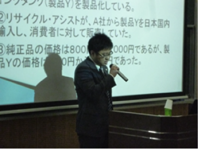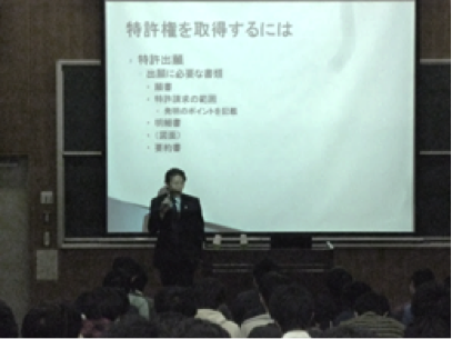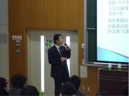 内 容 | 今回の専門家講座は、神戸大学工学研究科における「知的財産の基礎」の授業の一コマにおいて開催したもので、知財の形成、活用、収益構造などについて、公認会計士・税理士の海崎氏、弁理士の小野氏、弁護士の細井氏にそれぞれの立場から解説していただいた。 まず、海崎氏が、キヤノンの経営環境について、解説された上で、キヤノンの利益の推移と分析などを通して、消耗品の独占的販売を堅持する消耗品ビジネスモデルについて解説された。 続いて、小野氏が、消尽論についてシャチハタ(登録商標)スタンプを例に挙げて、キャップの修理、インクのしみ出すゴムの修理が特許権の侵害になるかなどを解説された上で、キヤノンのインクカートリッジの特許に関して、インクの再充填の特許権侵害成立性について解説された。 次に、細井氏が、インクタンク事件の概要、民事訴訟の流れ、原告被告の主張、裁判所の判断について解説された。 |